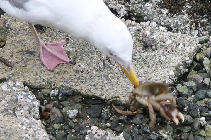 A seagull catching and eating a crab.